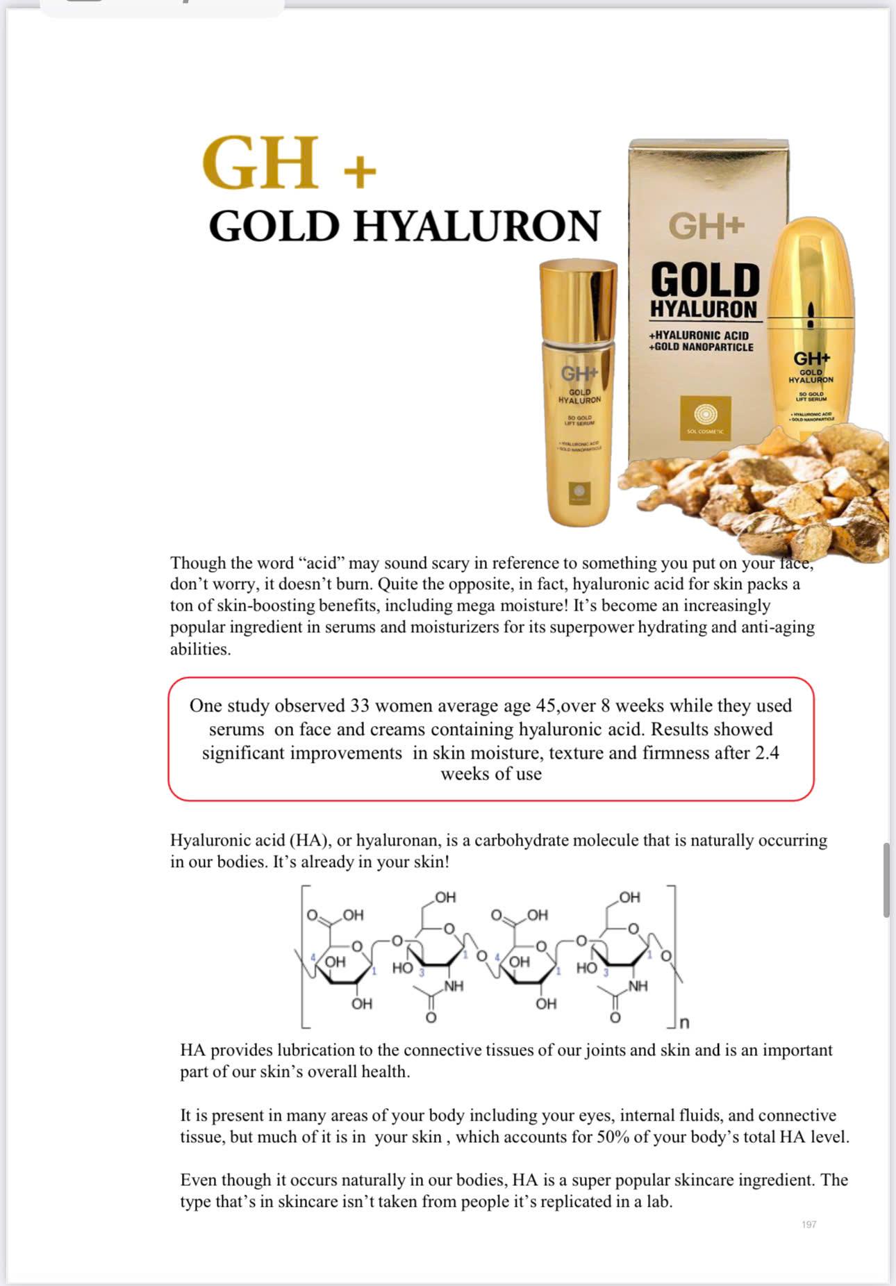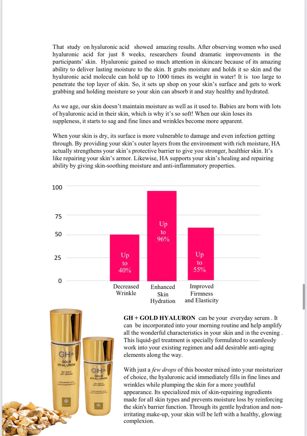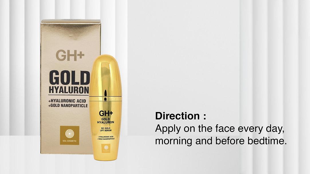 GH+ Gold Hyaluron Serum kết hợp sức mạnh của vàng nguyên chất 99,99%, axit hyaluronic và tế bào gốc táo Thụy Sĩ để mang đến một giải pháp chống lão hóa đột phá. Serum này giúp giảm thiểu các dấu hiệu lão hóa, mang lại làn da mịn màng, mềm mại, căng mọng, săn chắc và rạng rỡ. Khám phá bí quyết làn da trẻ trung, tràn đầy sức sống với những thành phần tiên tiến này, giúp bảo vệ, trẻ hóa và nuôi dưỡng làn da.