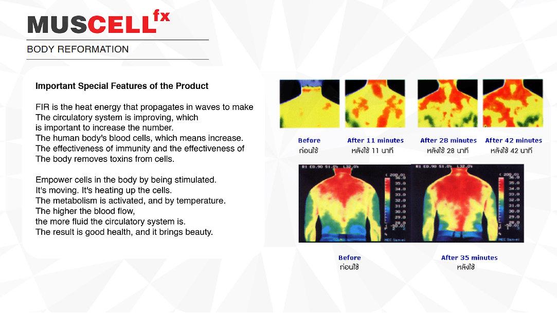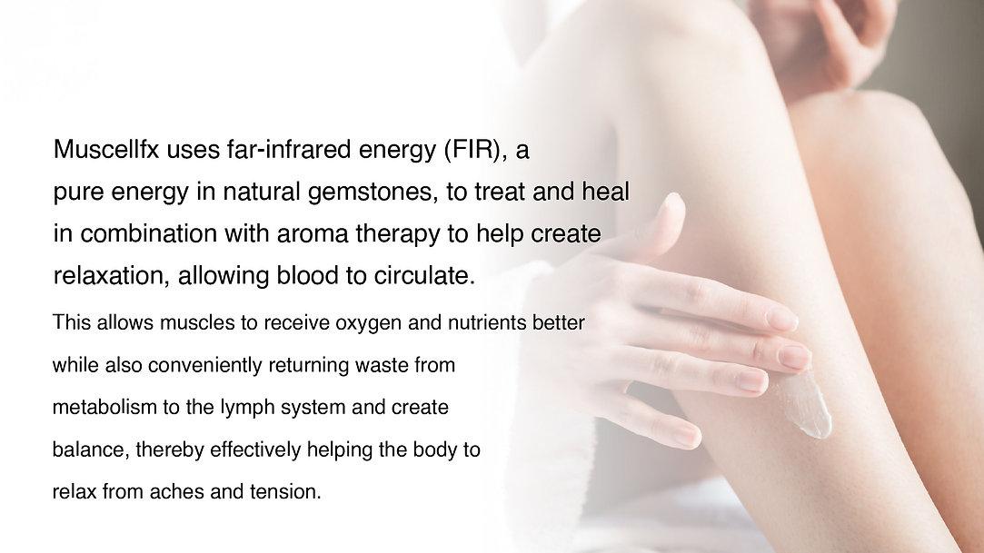 Muscellfx kết hợp năng lượng FIR từ đá quý tự nhiên với liệu pháp hương thơm để thúc đẩy thư giãn và cải thiện lưu thông máu. Điều này giúp cơ bắp nhận được nhiều oxy và chất dinh dưỡng hơn đồng thời loại bỏ chất thải từ quá trình trao đổi chất.