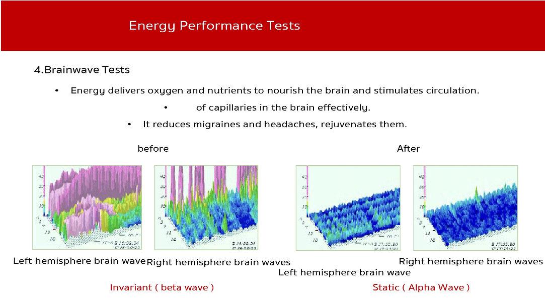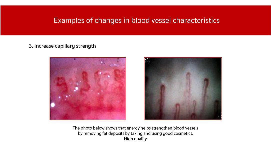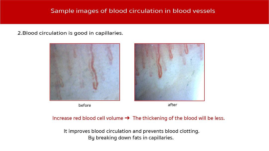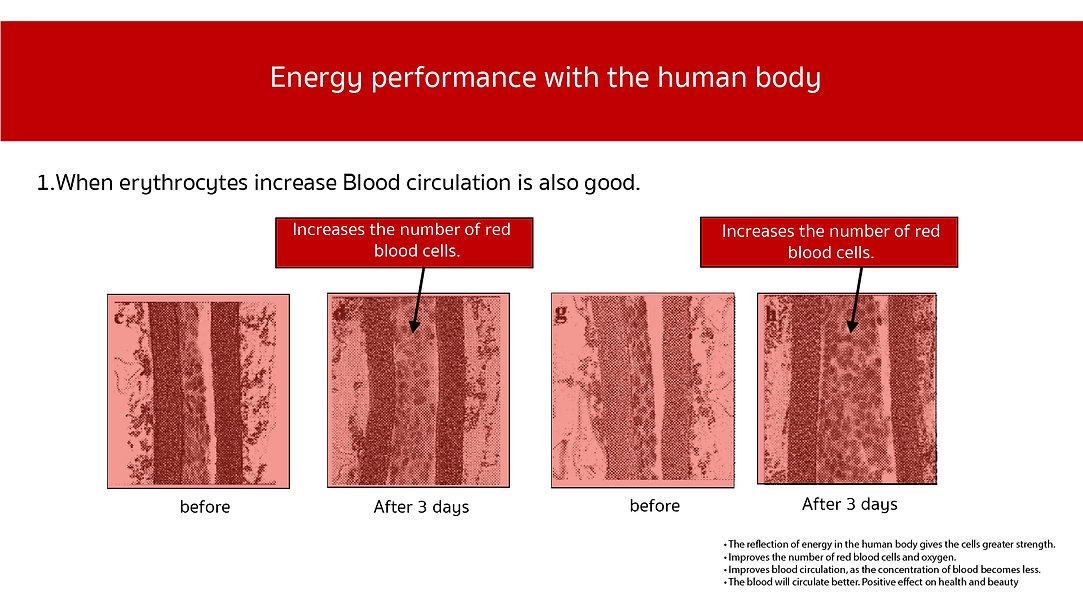 Kết quả thực nghiệm cho thấy trước khi sử dụng năng lượng FIR, các tế bào máu có xu hướng kết dính do mệt mỏi hoặc căng thẳng. Sau khi sử dụng FIR, sự cộng hưởng xảy ra, cải thiện việc cung cấp oxy và làm cho các tế bào máu tách rời, giúp tăng cường lưu thông.